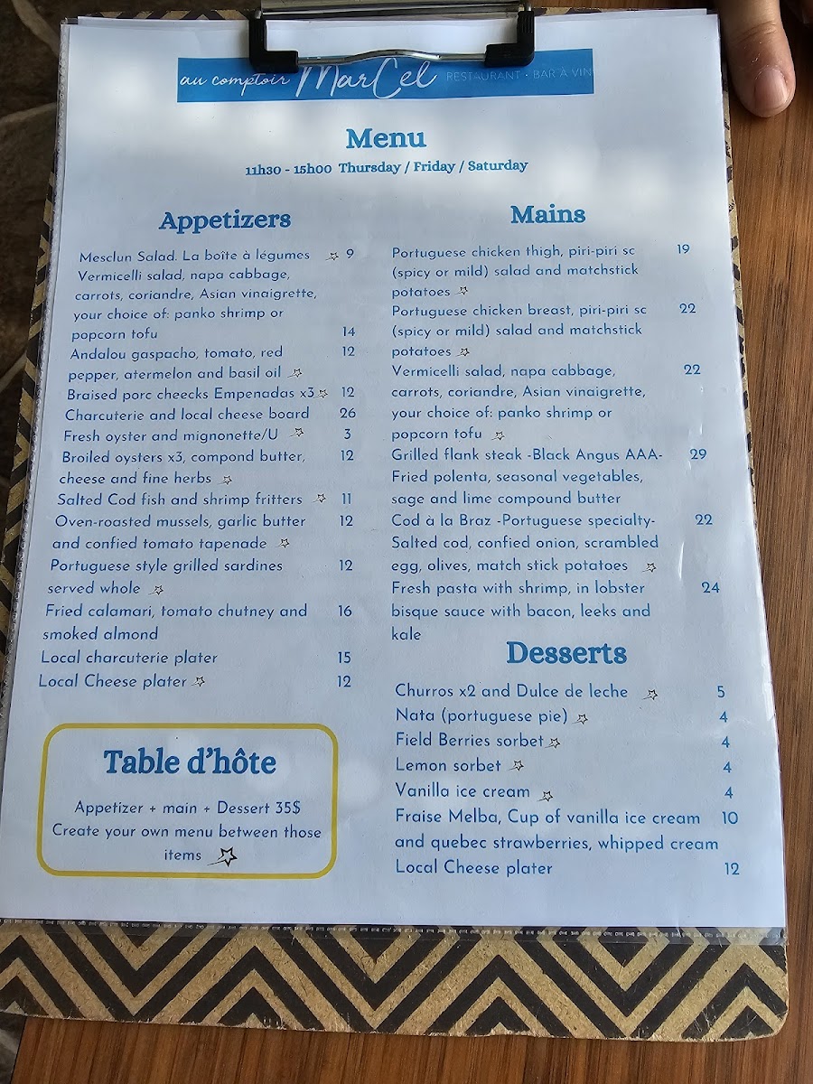 Located in the heart of Magog, Au Comptoir MarCel offers a delightful culinary journey that highlights local flavors and seasonal ingredients. The menu boasts a range of thoughtfully crafted dishes, beginning with tantalizing appetizers like the Braised Pork Cheeks Empanadas and Salted Cod Fish and Shrimp Fritters. For mains, the Grilled Flank Steak is a must-try, perfectly cooked with sides that elevate the overall experience.